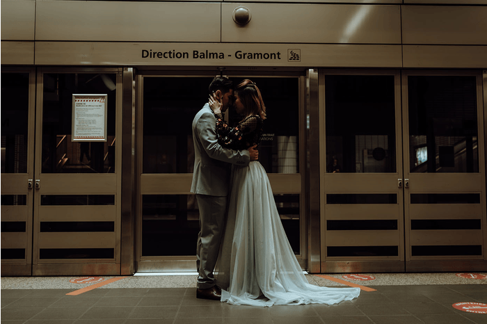 A l’image du ciel, la robe d'Emma est dans une teinte bleu-gris. Une ode à ce ciel observé pendant des jours depuis leurs fenêtres.